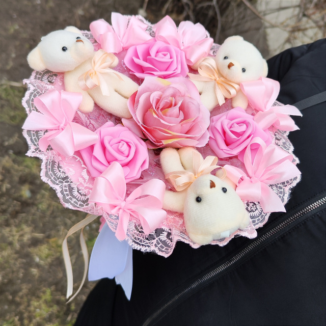 Букет з м’яких іграшок виглядає дуже мило, святково та витончено — ідеальний вибір для ніжного та романтичного подарунка.