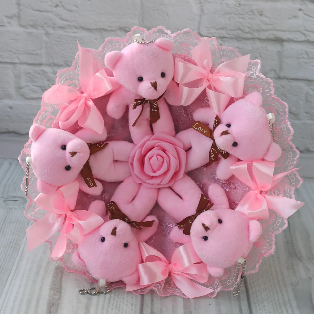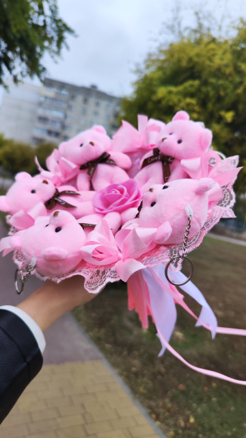 Букет з м’яких іграшок виглядає дуже мило, святково та витончено — ідеальний вибір для ніжного та романтичного подарунка.