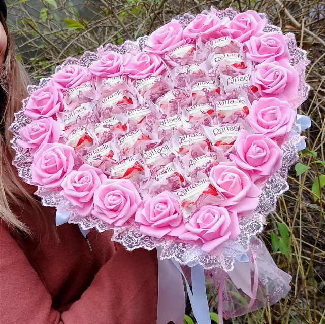 Великий рожевий букет із цукерок Raffaello у формі серця — розкішний солодкий подарунок для коханої дівчини або дружини на День закоханих, 14 лютого, 8 Березня чи іншу романтичну подію.