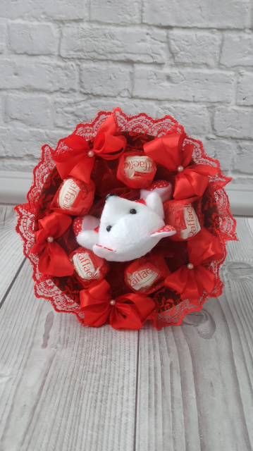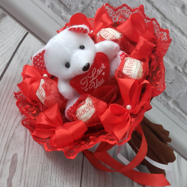 Композиція поєднує у собі дві улюблені складові — плюшеву м’яку іграшку та солодощі Raffaello, що робить букетик універсальним і завжди доречним подарунком.