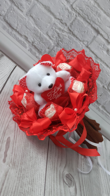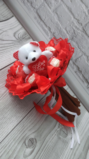 Червоний колір символізує пристрасть, кохання та щирі почуття, тому такий букетик виглядає особливо акуратно, світло та святково. Він не зів’яне, не потребує догляду та ще довго нагадуватиме про вас.