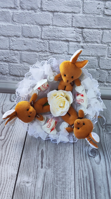 Надійне пакування гарантує безпечну доставку, щоб букет з м’яких іграшок та цукерок Raffaello приїхав цілим і не пошкодженим.