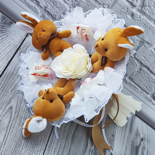 Букет з м’яких іграшок та цукерок виглядає дуже мило, святково та витончено — ідеальний вибір для ніжного та романтичного подарунка.