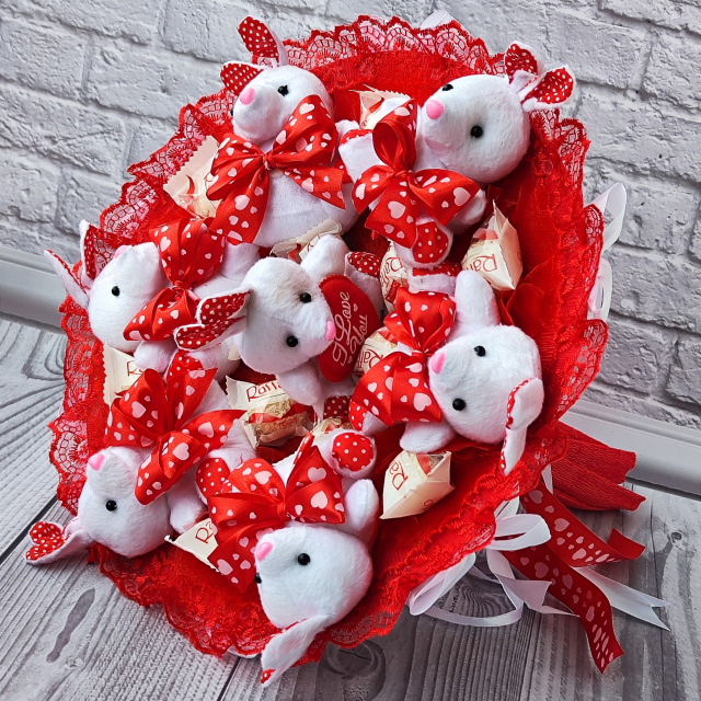 Великий червоний букет з білих м’яких ведмедиків та цукерок Raffaello (Рафаелло ) — яскравий, стильний та дуже емоційний подарунок, який чудово замінює класичні квіти.