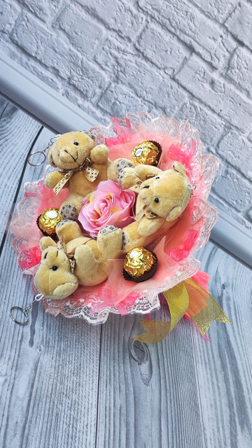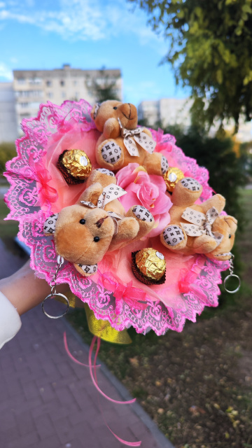 Купити рожевий букет з плюшевих ведмедиків та цукерок Ferrero Rocher — це ніжний, стильний подарунок, який гарантовано викликає вау-ефект