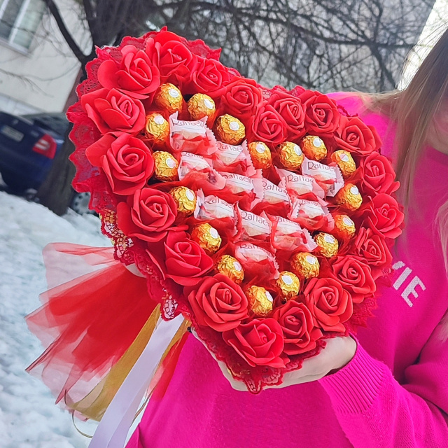 Поєднання цукерок Raffaello та Ferrero Rocher з декоративними трояндами створює велику презентазібельну композицію, яка підкреслює почуття, увагу та турботу. Букет не в’яне, довго зберігає гарний вигляд і стане ідеальною альтернативою живим квітам.