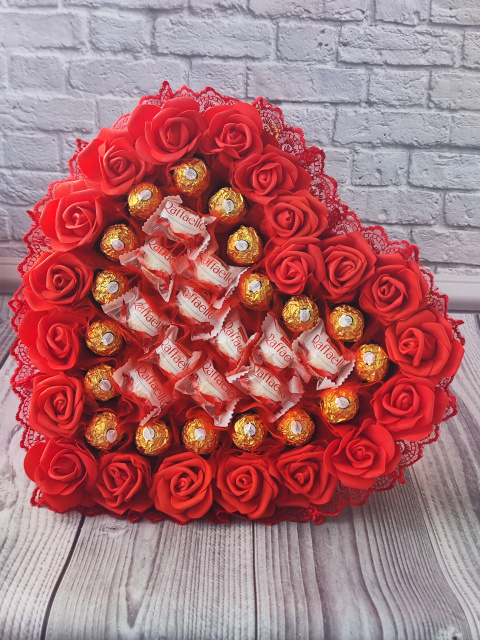Великий червоний букет із цукерок Raffaello та Ferrero Rocher у формі серця — розкішний солодкий подарунок для коханої дівчини або дружини на День закоханих, 14 лютого, 8 Березня чи іншу романтичну подію.