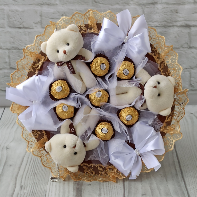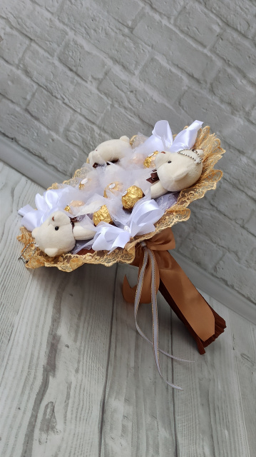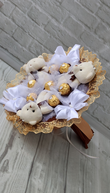 Яскравий золотистий букет з м’яких ведмедиків та цукерок Ferrero Rocher (Фереро Роше) — ніжний, стильний та дуже емоційний подарунок, який чудово замінює класичні квіти.