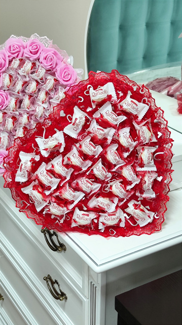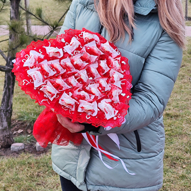 Великий червоний букет із цукерок Raffaello у формі серця — розкішний солодкий подарунок для коханої дівчини або дружини на День закоханих, 14 лютого, 8 Березня чи іншу романтичну подію.